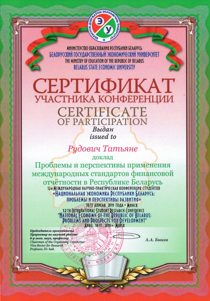 - Рудович Татьяна Витальевна, группа УП-31 - «Проблемы и перспективы применения МСФО в Республике Беларусь».