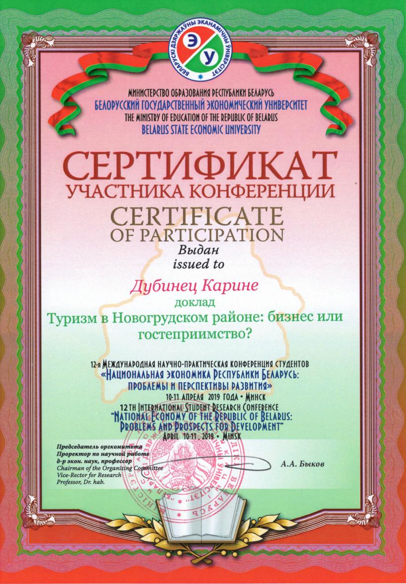 - Дубинец Карина Андреевна, группа УП-21 - «Туризм в Новогрудском районе: бизнес или гостеприимство?»;