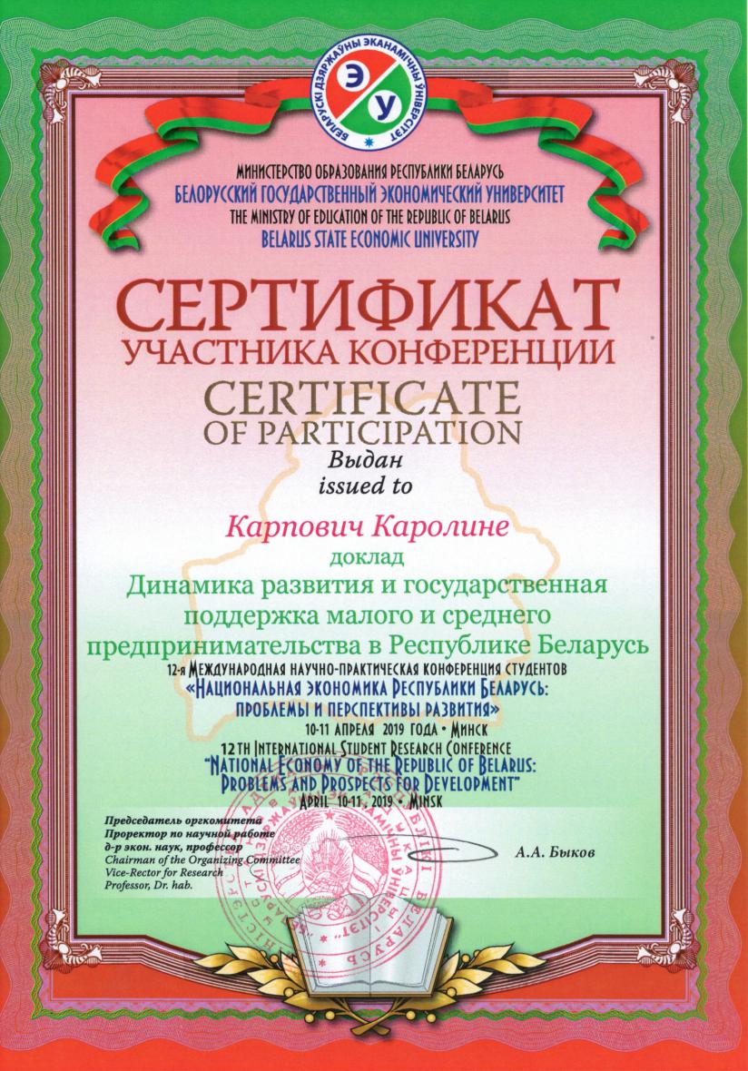 - Карпович Каролина Дмитриевна, группа БД-21 - «Динамика развития и государственная поддержка МСП в Республике Беларусь»;