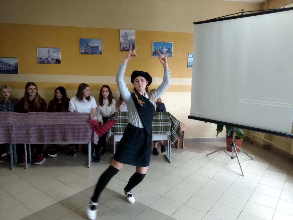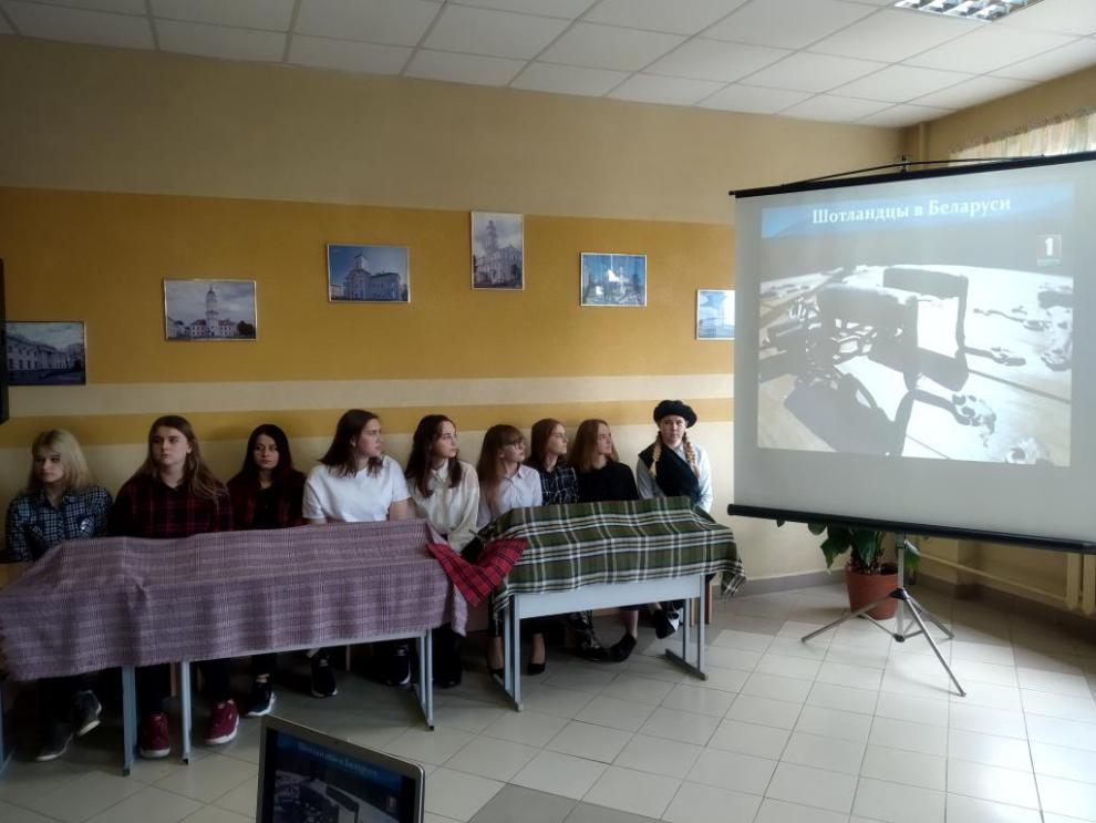 Цель мероприятия – знакомство учащихся с традициями и обычаями Шотландии. Учащиеся узнали о пребывании шотландцев в Беларуси, о том, что у белорусов и шотландцев есть некоторое сходство в традициях и обычаях: горские игры в Шотландии схожи с нашей традицией проводов зимы (перетягивание каната, лазание на столб). Учащаяся группы БД-1 Хлюст Виктория исполнила шотландский танец.