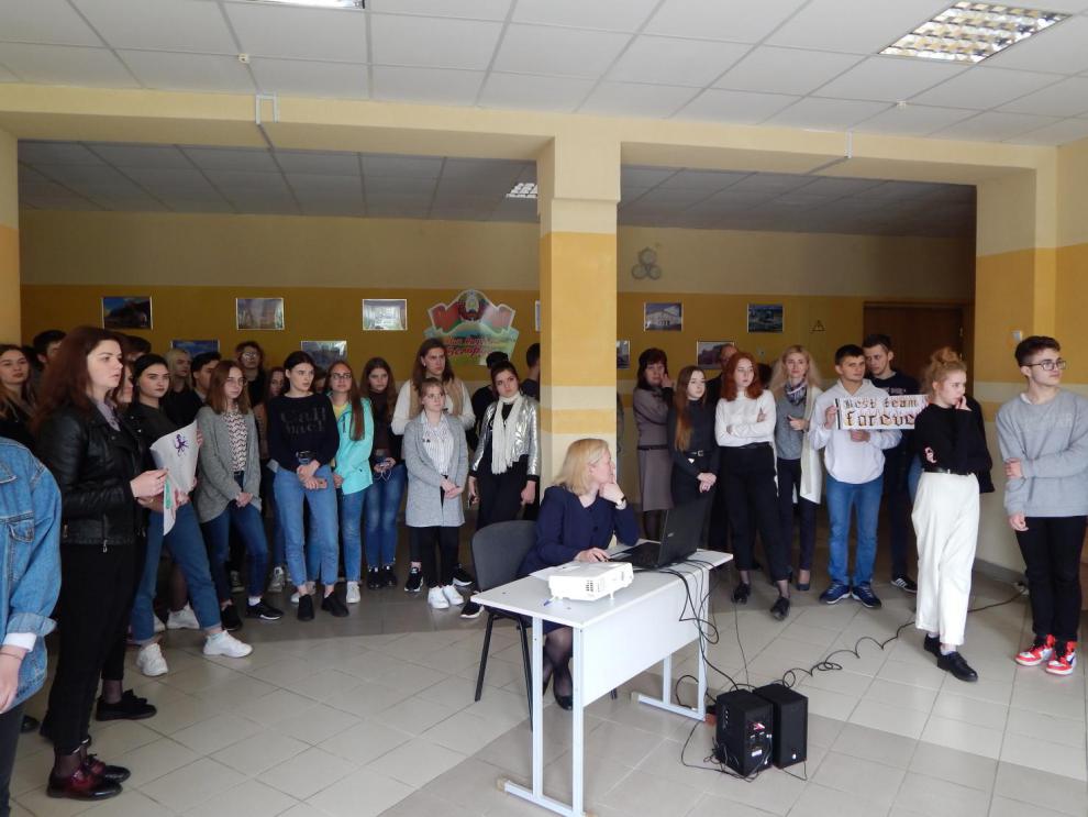«Что мы знаем о Великобритании». Учащиеся, разделившиеся на две команды, отвечали на вопросы по истории, культуре и традициям Великобритании. Зрители активно поддерживали команды. Победившая команда группы УПп-22 получила сладкий приз.