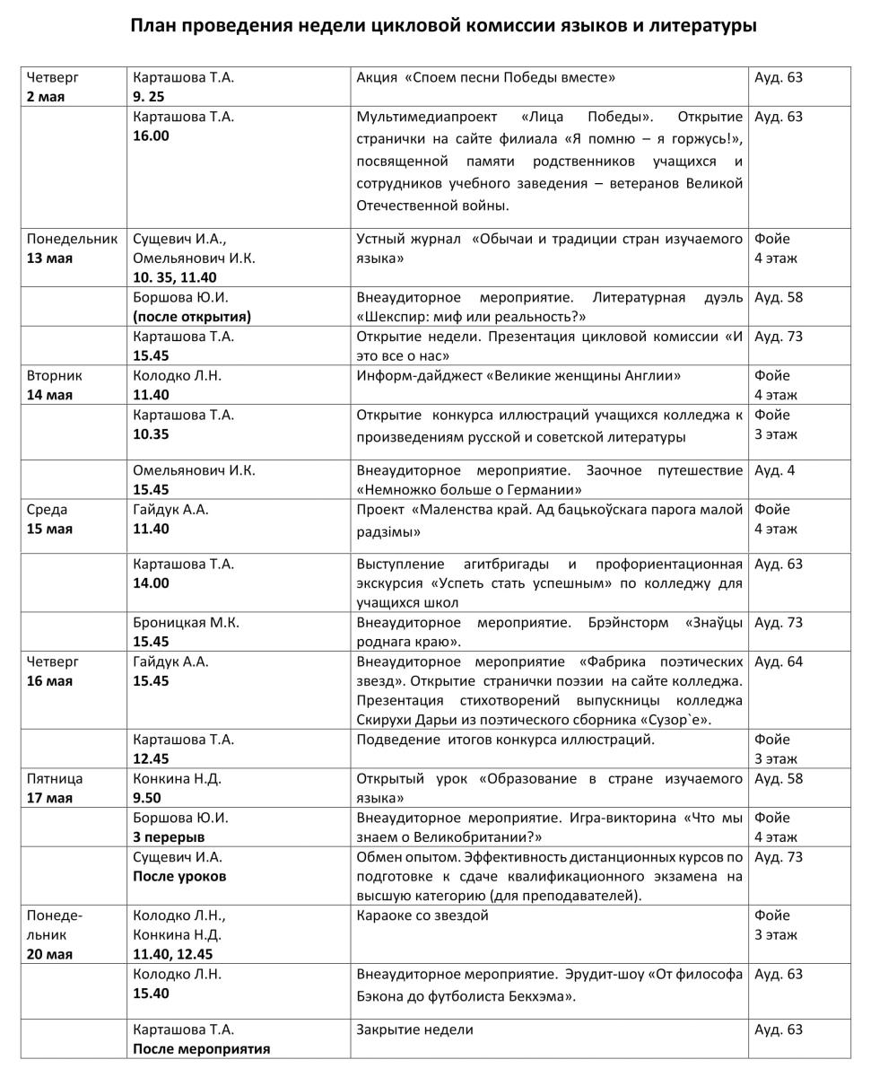 С 13 по 20 мая в филиале проходила неделя цикловой комиссии языков и литературы, которая способствовала повышению интереса обучающихся к изучаемым дисциплинам и помогла создать условия для развития творческой активности учащихся. Два мероприятия, посвящённые Дню Победы, были вынесены за рамки недели и проведены 2 мая.