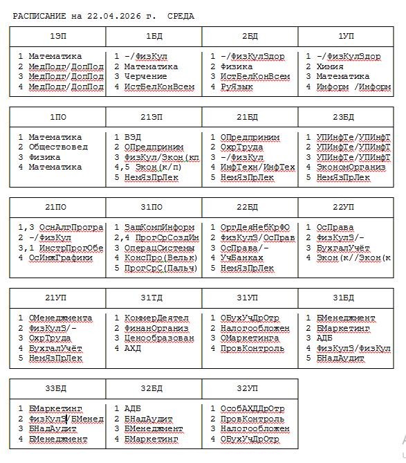 Расписание занятий Просмотров: 141843 Расписание учебных занятий и факультативов Расписание для учащихся Расписание для преподавателей Расписание факультативных занятий (1-е курсы) Расписание факультативных занятий (2-4-е курсы) Расписание звонков